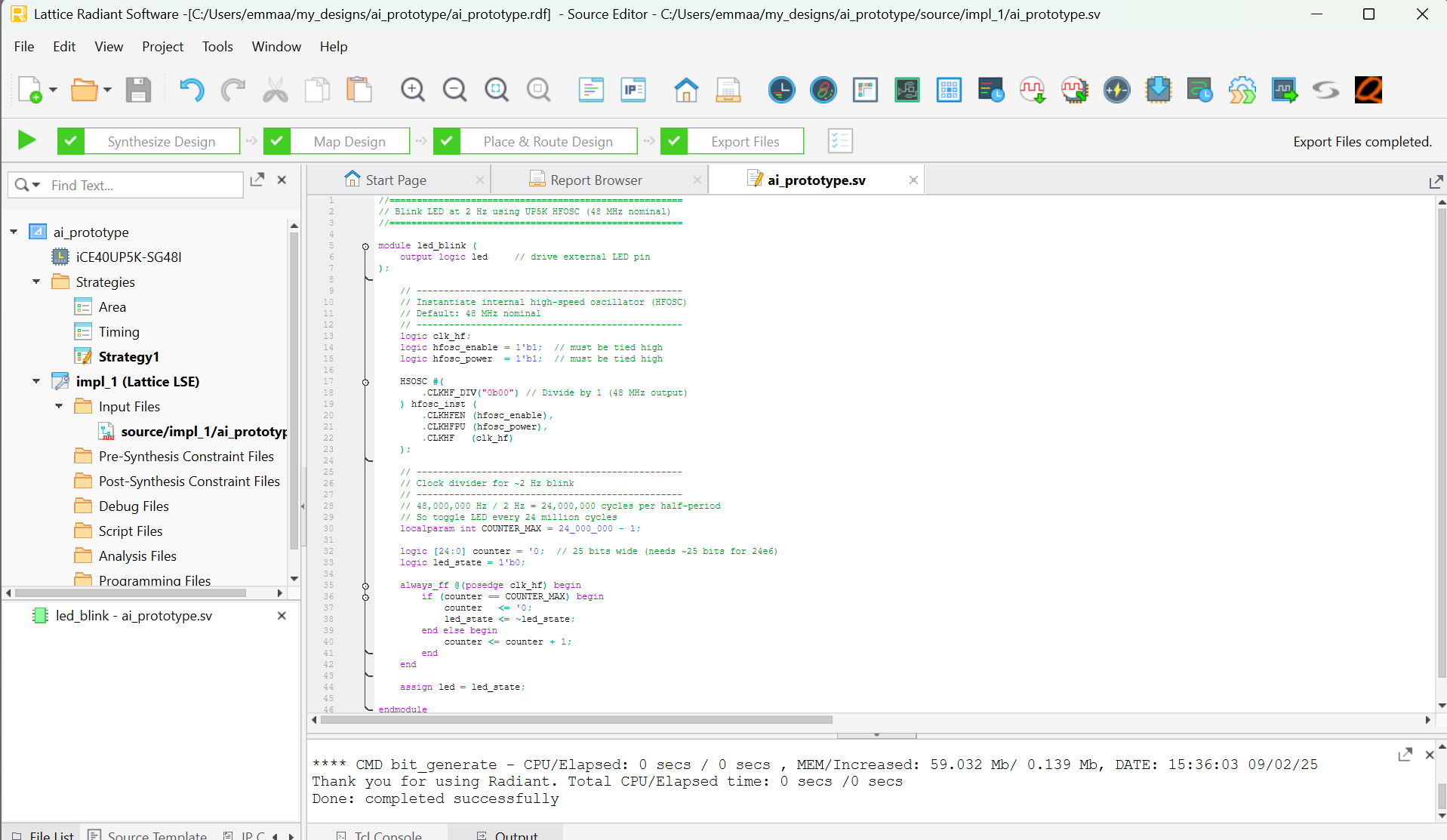 Just looking at how the ai solved the problem I can see that it seemed to define variables when maybe they weren’t really needed. However, the ouput seems right it does seem to produce the correct blinking. The LLM used localparam int which is a new variable type or at least one I haven’t seen used a lot. Althought the LLM synthesized I have a feeling there would be issues either simulating the code or testing it in hardware since that was still true for my own code. I think using AI at the end shows you that the logic and structure I used was correct and pretty standard however you need to work through it on your own in order to trust what the LLM is producing.