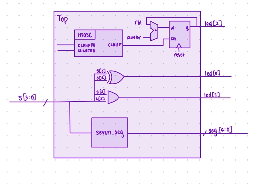 The first step in the design was to determine the logic needed for the LEDs which resulted in an XOR, AND gates. The blinking LED used the on-board high-speed oscillator to generate a 48 MHz clock signal, then a counter was used at a cycle of 10000000 to generate a 2.4 Hz blinking frequency. The second part of the design included the 7 segment display module that mapped the binary input to the neccesary segments that need to be turned on to the display the digit.