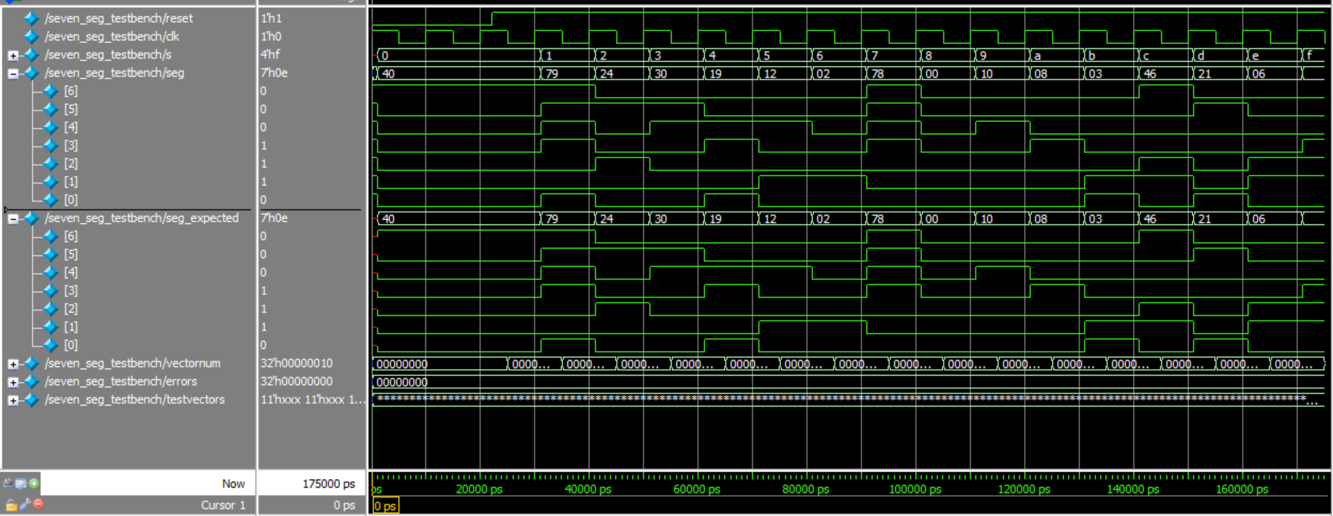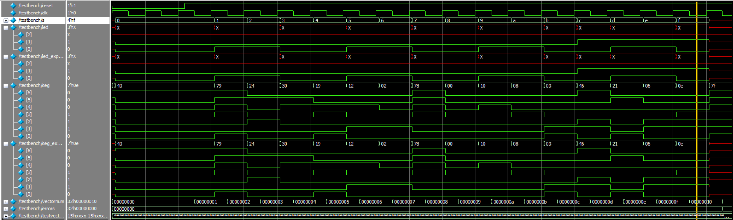 The design was tested using automatic testbenches in Questa. Testbenches were written for both the top module and the 7 segment display module. Testvectors with inputs and expected output values were given to compare the program outputs to the expected outputs. The waveforms were generated and compared to show that all 16 input values matches the segment display and led expectations. These simulations confirmed the physical behavior expected from the board.