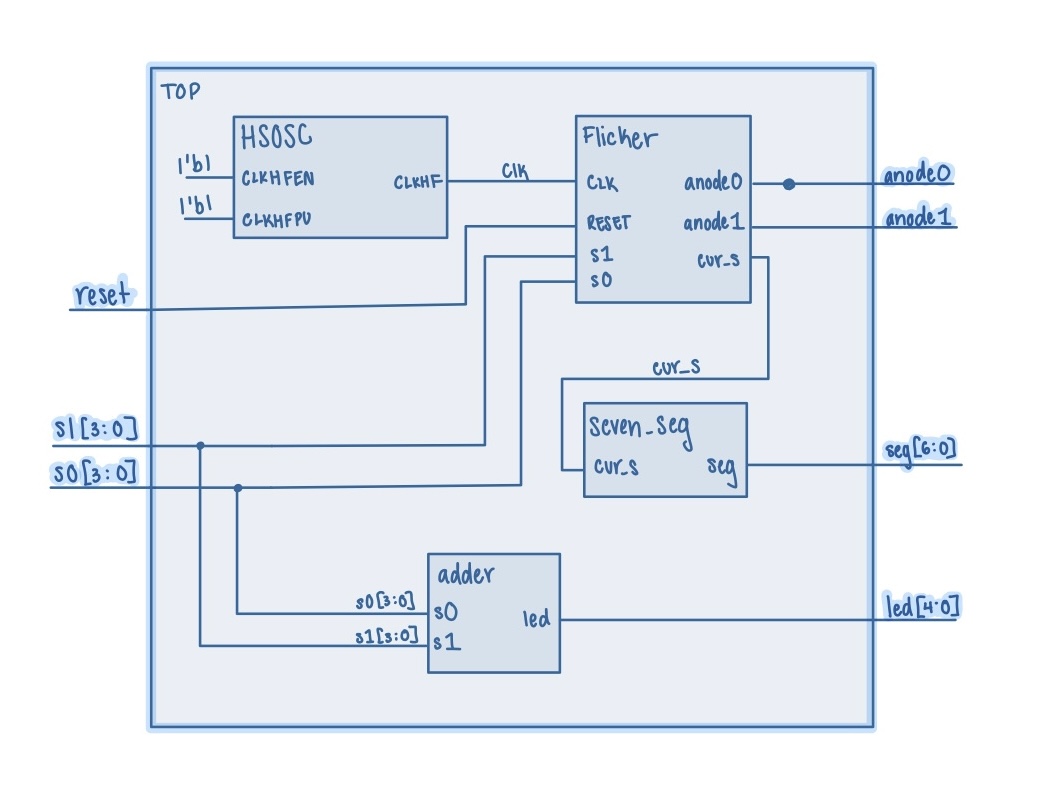 The block diagram in Figure 1 demonstrates the overall architecture of the design. The top module utilizes the HSOSC built in module for the clk. The submodule seven_seg handles the seven segment display outputs. The submodule adder handles the addition of s0 and s1 for the led output and the submodule flicker handles the alternating flickering signals and outputting the correct s value to be displayed at a given time.