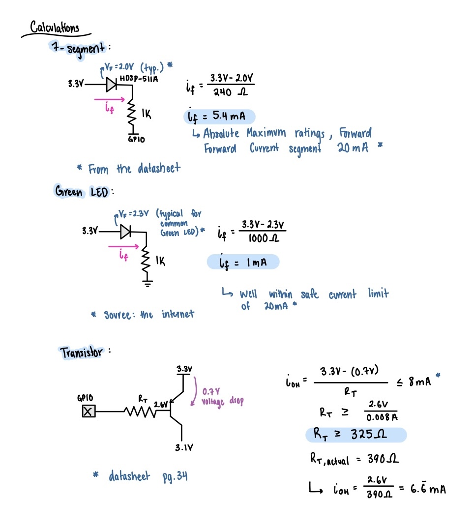 Figure 3 shows the current draw calculation for the seven segment LED display, green LEDs, and transistor circuit. For the seven segment display, using the forward voltage from the data sheet and a 240 ohm resistor we can solve for the current through the LED which comes out to 5.4 mA. This current is pretty standard for an LED and is well under the absolute maximum forward current of 20 mA (from the datasheet).For the green LEDs the same calculation was used this time with a 1k ohm resistor to limit current down to 1 mA which is a very safe current for standard LEDs. For the transistor, we can take the difference of voltage from the 3.3V source and the 0.7V drop from the source to the gate and divide by R_t. The maximum output current from the FPGA pin is 8 mA per the datasheet. Solving the inequality results in the resisotr value must be greater than 325 ohms.