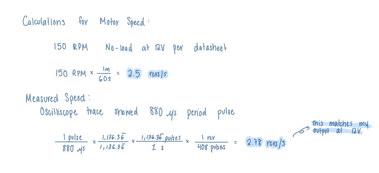 This shows calculations for the theoretical motor speed and then the motor speed calculated using an actual period measurement of the motor 12V.