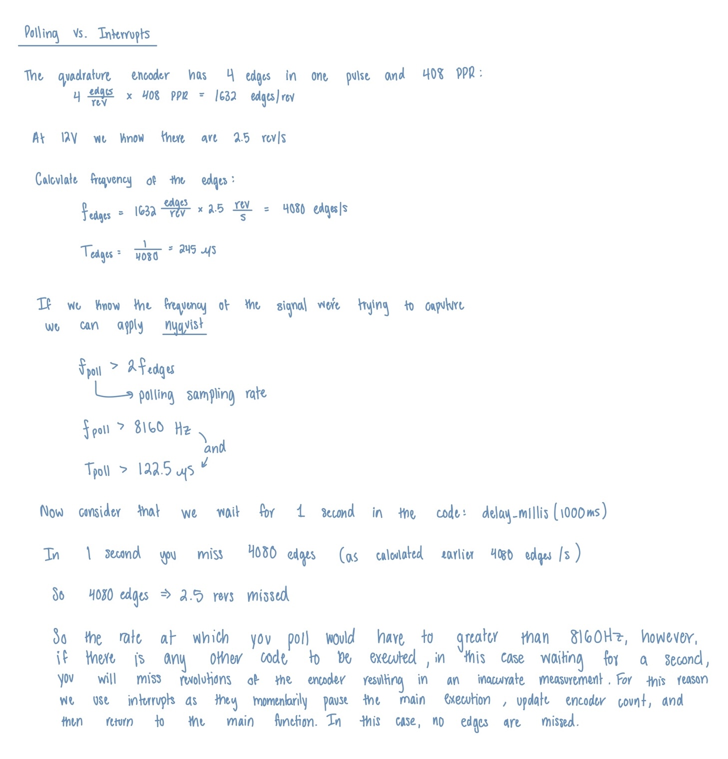 The above explains the differences between polling and interrupts and shows the error in the velocity measurement when using polling compared to interrupts.